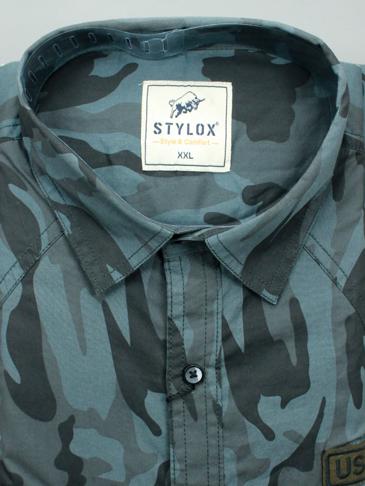 Embrace the tactical look with this Blue/Gray Camouflage Shirt. Featuring a modern camo print, utility chest pockets, and durable stitching, this shirt offers a rugged and stylish military-inspired design. Perfect for statement casual wear and layering.