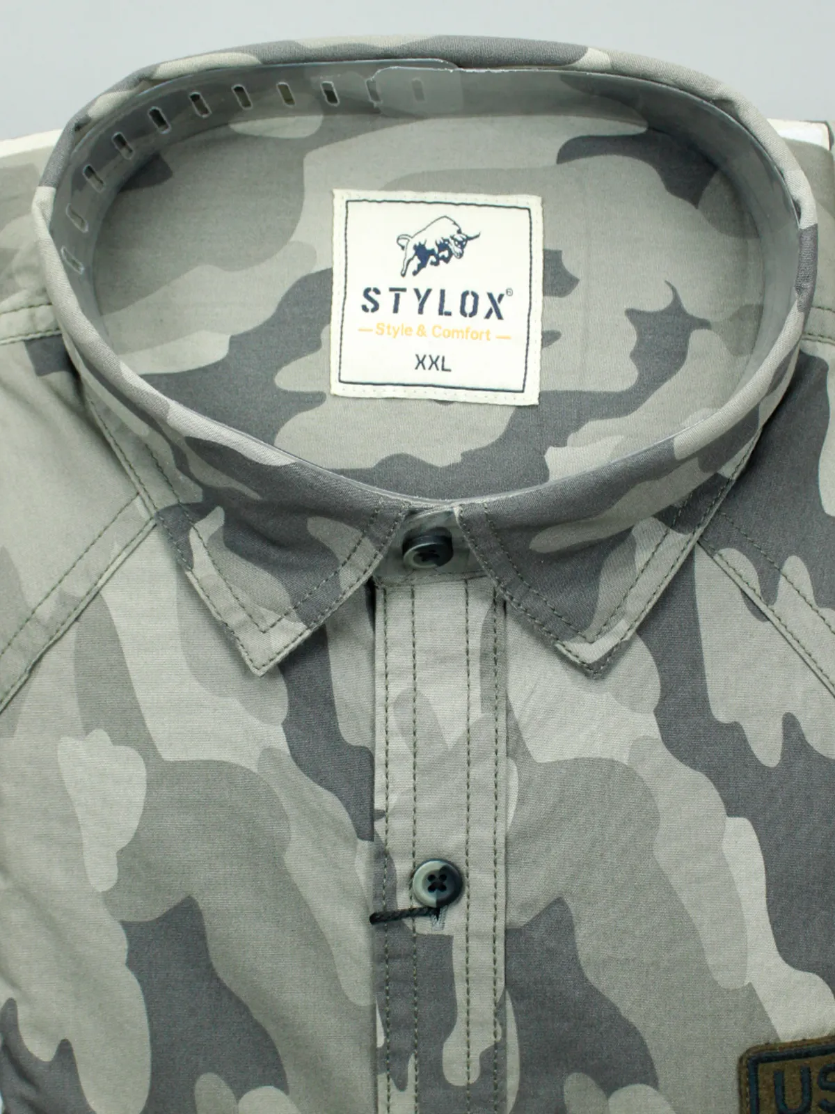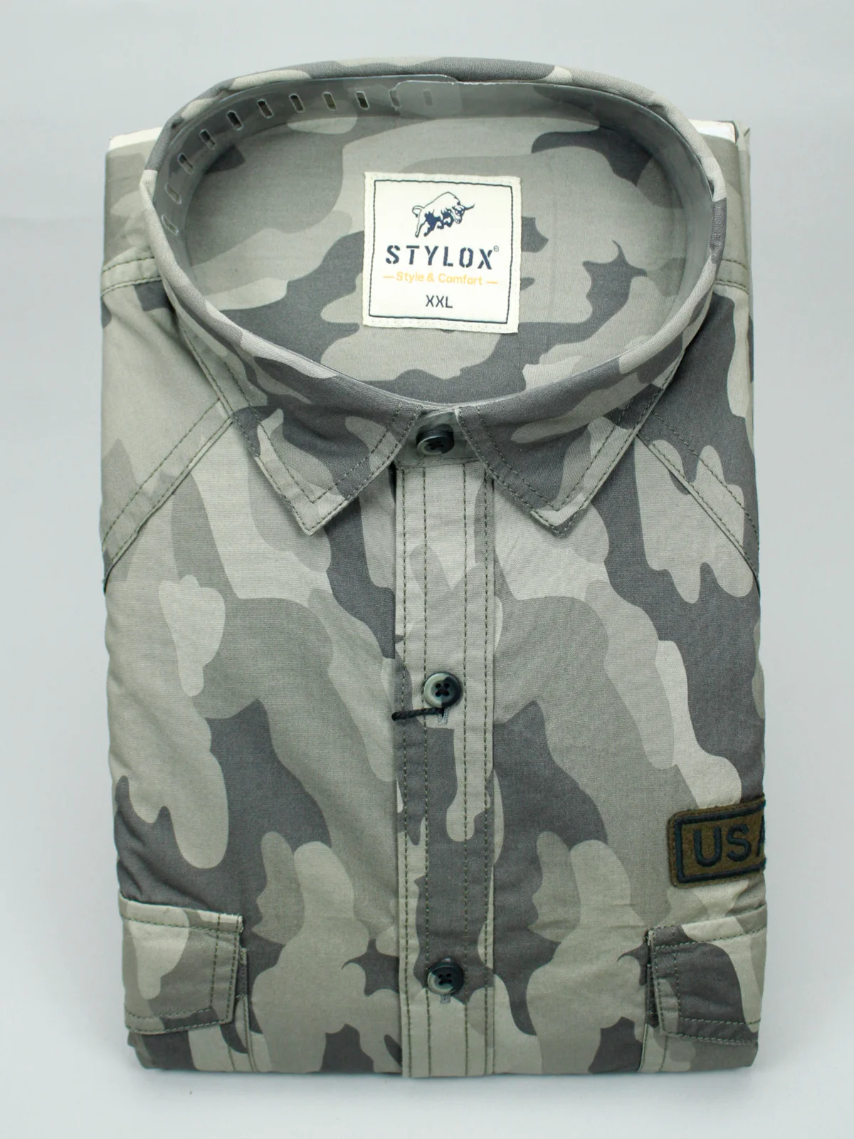 A rugged yet refined look. This Gray Camouflage Shirt features a subtle, light-toned camo pattern and military-style details, including twin utility pockets and durable construction. Ideal for a modern, statement-making casual or streetwear outfit.