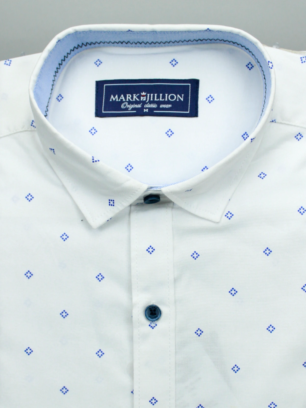 Define clean style with the Men’s White Micro-Geometric Print Cotton Shirt. The pristine white cotton fabric provides a sharp canvas for the delicate, repeating blue geometric print, adding visual interest without sacrificing formality. Enhanced by cool blue accents on the collar lining and buttons, this shirt delivers a refined, versatile, and effortlessly polished look for any occasion